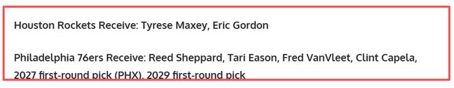 就在火箭队上下陷入困境,球迷们忧心忡忡之际,BleacherReport知名分析师扎克·巴克利抛出了一项极具创新性的交易提案,为火箭队带来了新的希望。这份提案的核心,是让火箭队通过交易得到费城76人队的明星后卫泰瑞斯·马克西以及老将埃里克·戈登,以此来填补范弗利特伤缺留下的空缺。而76人队则将获得里德·谢泼德、塔里·伊森、弗雷德·范弗利特、克林特·卡佩拉,外加2027年菲尼克斯太阳队的首轮选秀权和2029年的首轮选秀权。这笔交易若能达成,无疑将成为本赛季NBA最具影响力的交易之一,对两支球队的未来走向产生深远影响。