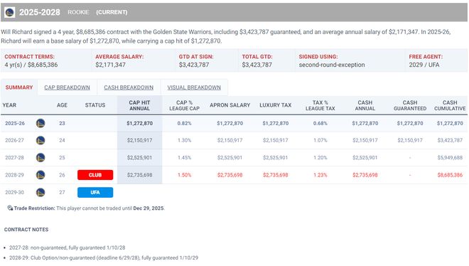 最后一位是威尔-理查德,他是今年56号秀他跟勇士队签下一份四年869万的新秀合同,合同前两年保障,后两年不保障+球队选项,第一年薪水127.2万,第二年215万,第三年252万,第四年273万。