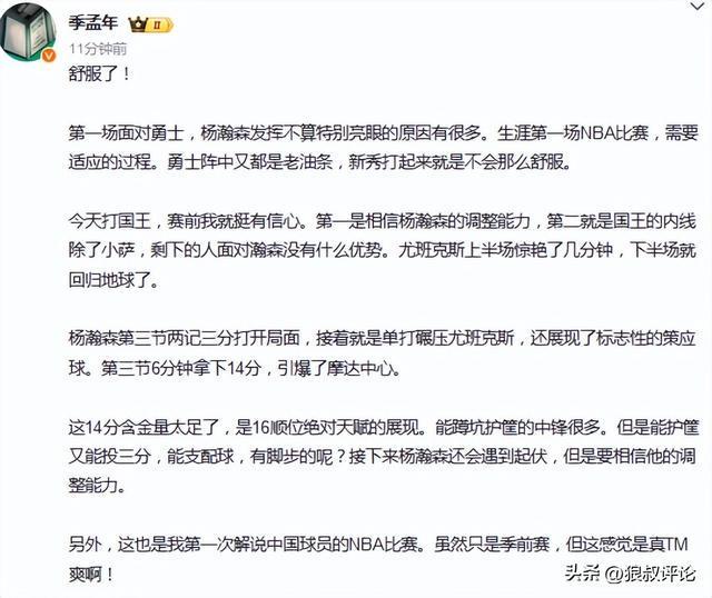 体坛周报记者孟季年表示:第一场面对勇士,杨瀚森发挥不算特别亮眼的原因有很多。生涯第一场NBA比赛,需要适应的过程。勇士阵中又都是老油条,新秀打起来就是不会那么舒服。
