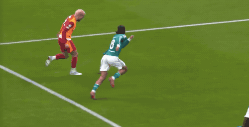 上半场补时阶段,加拉塔萨雷的高位逼抢收到效果,赫拉芬贝赫被断,之后他在背后放倒奥斯梅恩,还好是在禁区外。
